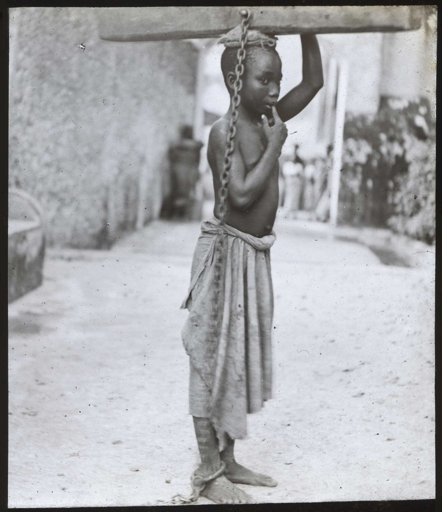 This photograph1 was taken in Stone Town, Zanzibar by an unknown missionary around 1890. The original is a lantern slide measuring just 83 x 83 mm, the width of a credit card, yet in that tiny space, it exemplifies the deep cruelty of the slave trade.