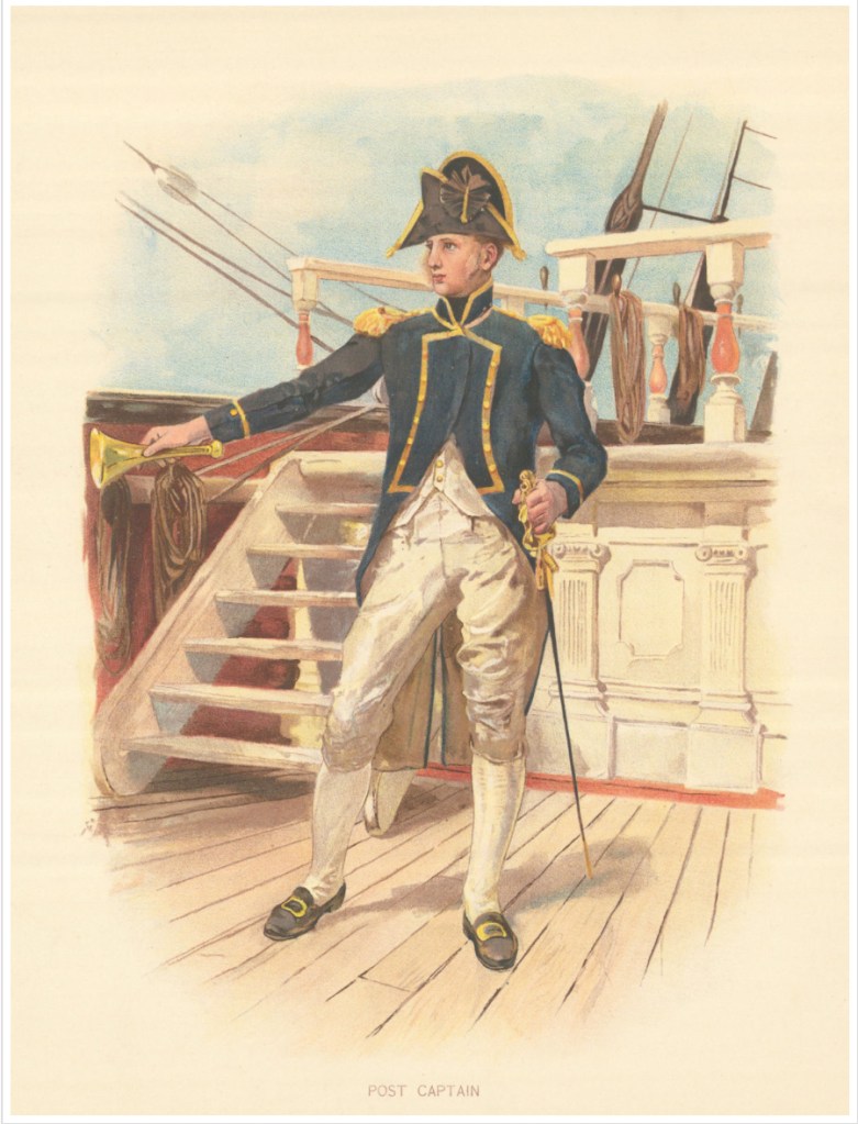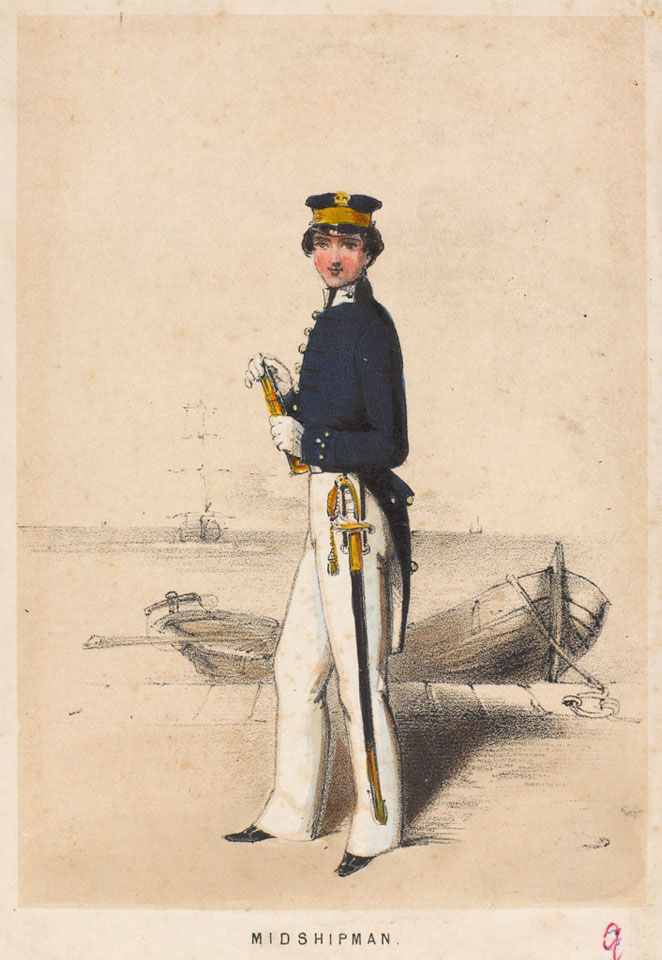 (A commodore of the 1840s stands with a Mate with a 2nd Class Boy in the background)
