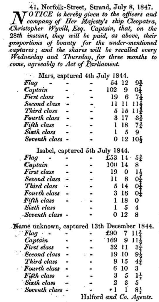 The award of prize money was announced in the London Gazette and, as can be seen in the example of three prizes taken by Cleopatra under the command of Captain Wyvill in 1843, the amounts varied significantly depending on rank. Wyvill earned around £375 from these three prizes at a time when he was probably earning £30 a month. Flag officers commanding squadrons or fleets also received a cut. ↩︎ - Christopher Saunders (1985) Liberated Africans in cape Colony in the First Half of the Nineteenth Century https://www.jstor.org/stable/217741?seq=1 ↩︎