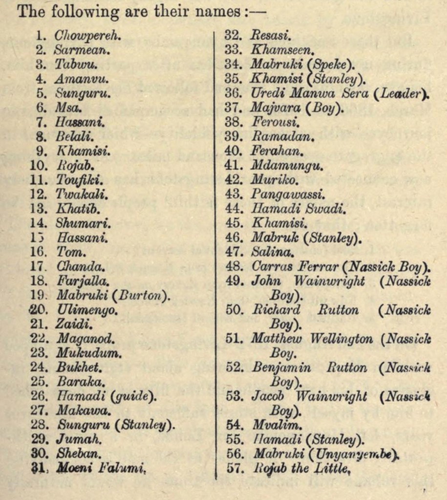 There are fifty-seven other names of people who arrived back at the coast with the body. Fifty-six are from the RGS list of people awarded their commemorative medal and the other one is N’taéka, Chuma’s Wife, who definitely arrived back in Zanzibar where, along with Halima she had been sent some money. N’taéka died in 1880. There seems to be no trace of Halima after their return, although she is the heroine of the excellent novel “Out of Darkness, Shining Light” by Petina Gappah. 61