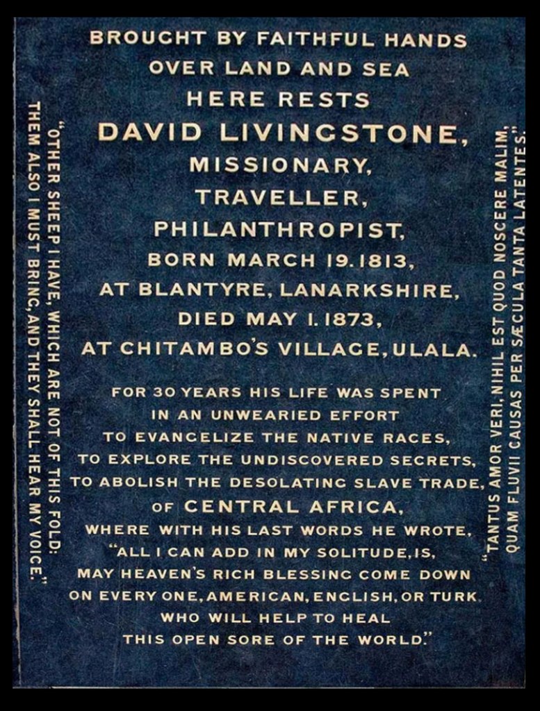 “Brought by faithful hands over land and sea, here rests David Livingstone.”