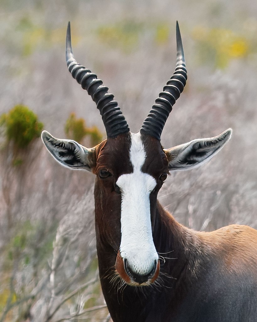 The broad face is similar to the hartebeest to which it is related but the Bontebok sports a striking white blaze stretching from above its black nose to just below its eye sockets above which it narrows to a white stripe running up to and between its strongly ridged black horns.