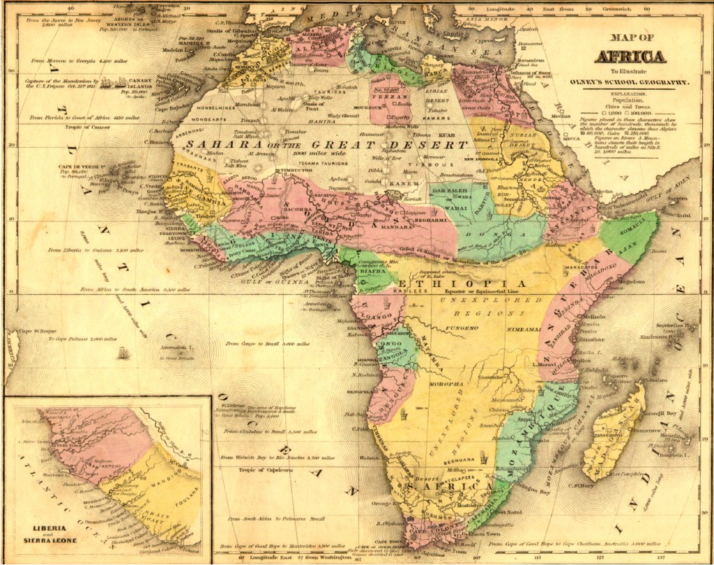 A British map of Africa published in 1840. The large dark yellow area in the middle is described as “Unexplored Regions”